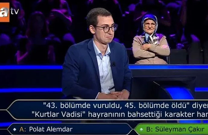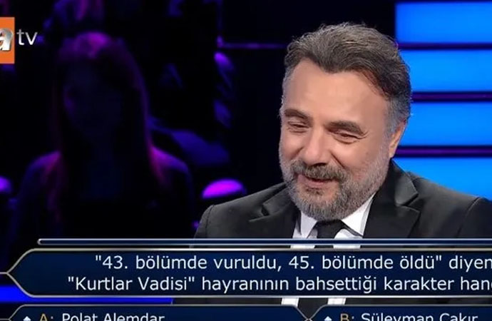 ATV'de yayınlanan Kim Milyoner Olmak İster'e katılan Kayra Özyar isimli yarışmacı, başarılı bir performans sergiledi. Yarışmacının karşısına çıkan 5. soru Oktay Kaynarca'yı duygulandırdı. İşte, o soru: "'43. bölümde vuruldu, 45. bölümde öldü' diyen bir 'Kurtlar Vadisi' hayranının bahsettiği karakter hangisidir?".
