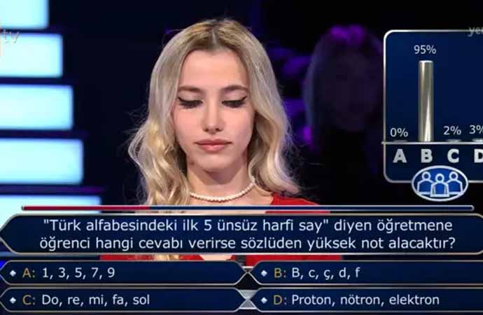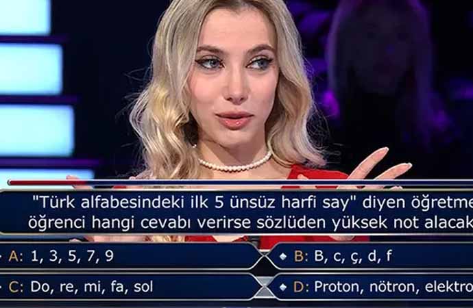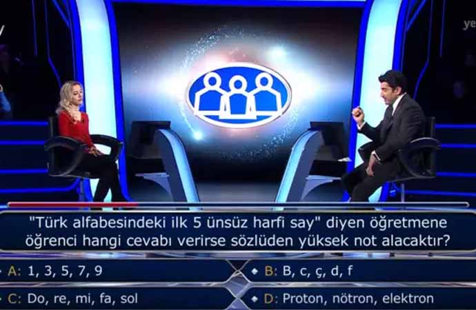 Yarışmacının henüz ikinci soruda karşısına, "Türk alfabesindeki ilk ünsüz 5 harfi say' diyen öğretmene öğrenci hangi cevabı verirse sözlüden yüksek not alacaktır?" sorusu çıktı.