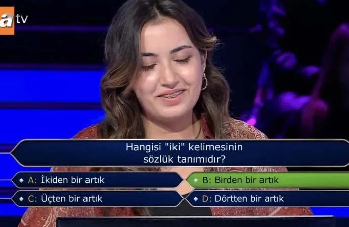 Galatasaray Üniversitesi Hukuk Fakültesi hazırlık öğrencisi Ayşe Naz Babalık'ın yarıştığı anlar 'Kim Milyoner Olmak İster'e damga vurdu. Yarışmacının 'seyirci jokeri'ni kullandığı soru ise herkesi şoke etti.
