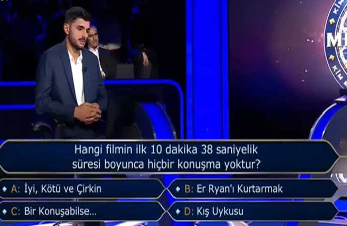 Programda, 200 bin TL karşılığında "Hangi filmin ilk 10 dakika 38 saniyelik süresi boyunca hiçbir konuşma yoktur?" sorusu yöneltildi.