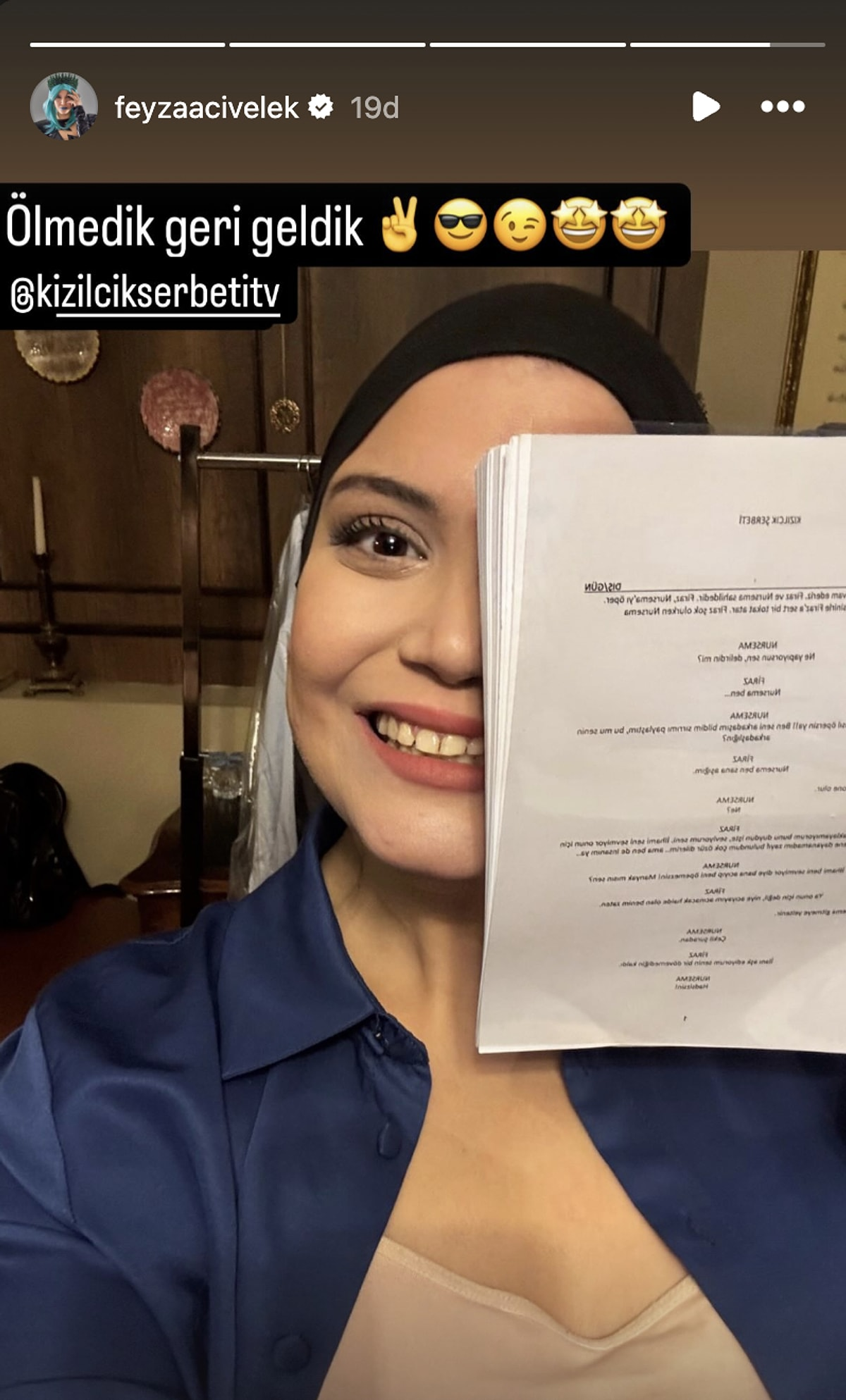 Civelek, Instagram hesabında "Hayatta kaldık ve geri döndük" notuyla bir gönderi paylaşarak 85. bölümün senaryosundan bir kısmı ifşa etti.
