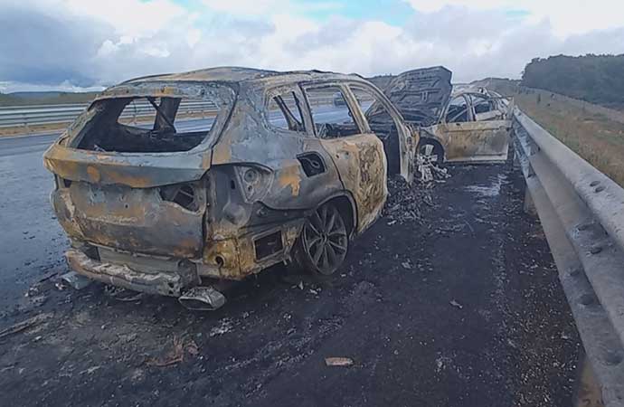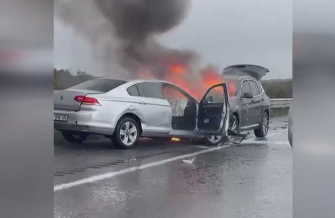 Zincirlemede kazada 4 kişi yaralanırken, 2 araç alev aldı. İhbarla bölgeye çok sayıda ekip gönderildi.