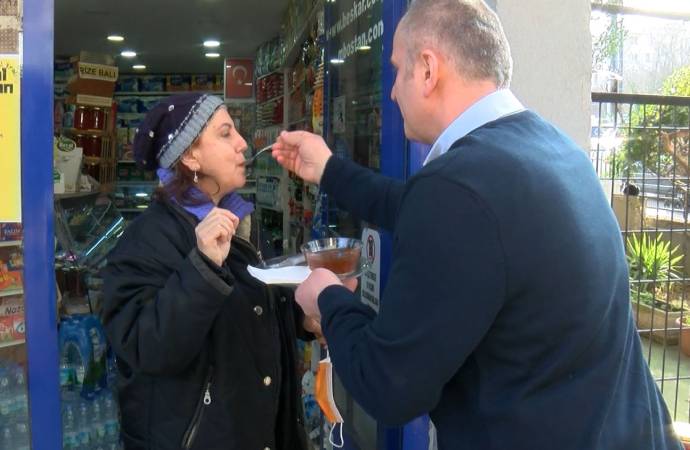 Bakkalın önünde sıraya giren Gülşen Şadoğlu, "Aşı sırasındayız şu an. Lazovac aşısı, iğnesiz bir aşı. Bizim komşumuz yıllardır. Bağışıklık sistemini kuvvetlendirdiği için bal gerçekten aşı yerine geçiyor. Aşı yerine derken normal aşınızı da olacaksınız" diye konuştu.