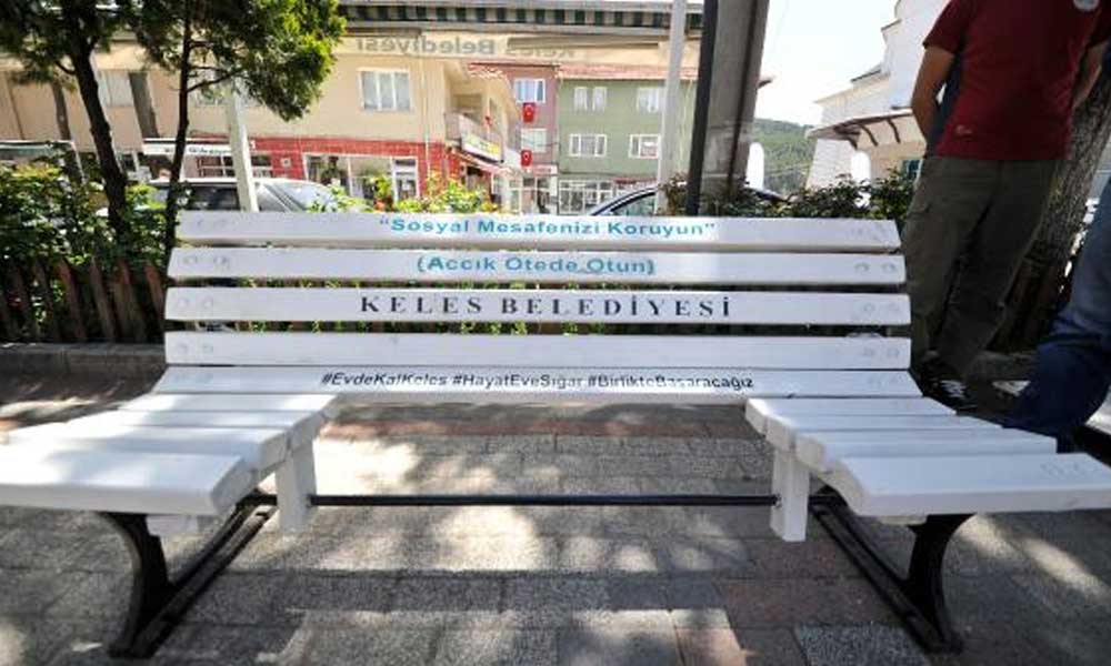 Keles Belediye Başkanı Mehmet Keskin, koronavirüs tedbirleri kapsamında banklarda sosyal mesafe düzenlemesine gidildiğini söyledi. Sadece iki uç kısmına oturulan bankların üzerine ise, ‘accık ötede otun’ yazıldı. Başkan Keskin, ramazanla birlikte toplu iftar organizasyonlarıyla artan vaka sayısının, uyarıların ardından düştüğünü belirtti.