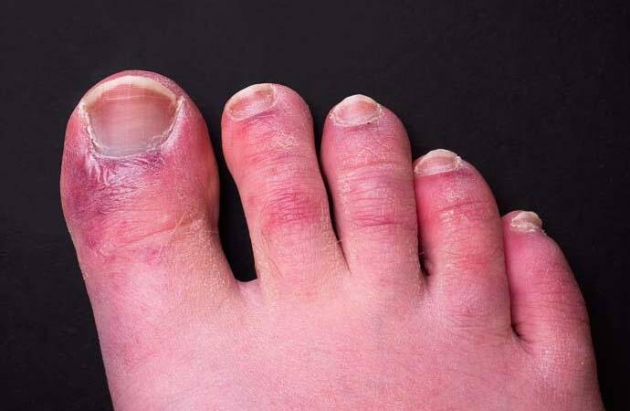 Genellikle ayak parmaklarında, nadiren ellerde de oluşan kırmızı veya mor renklerin bazen haftalar hatta aylarca devam edebileceği kaydedildi.