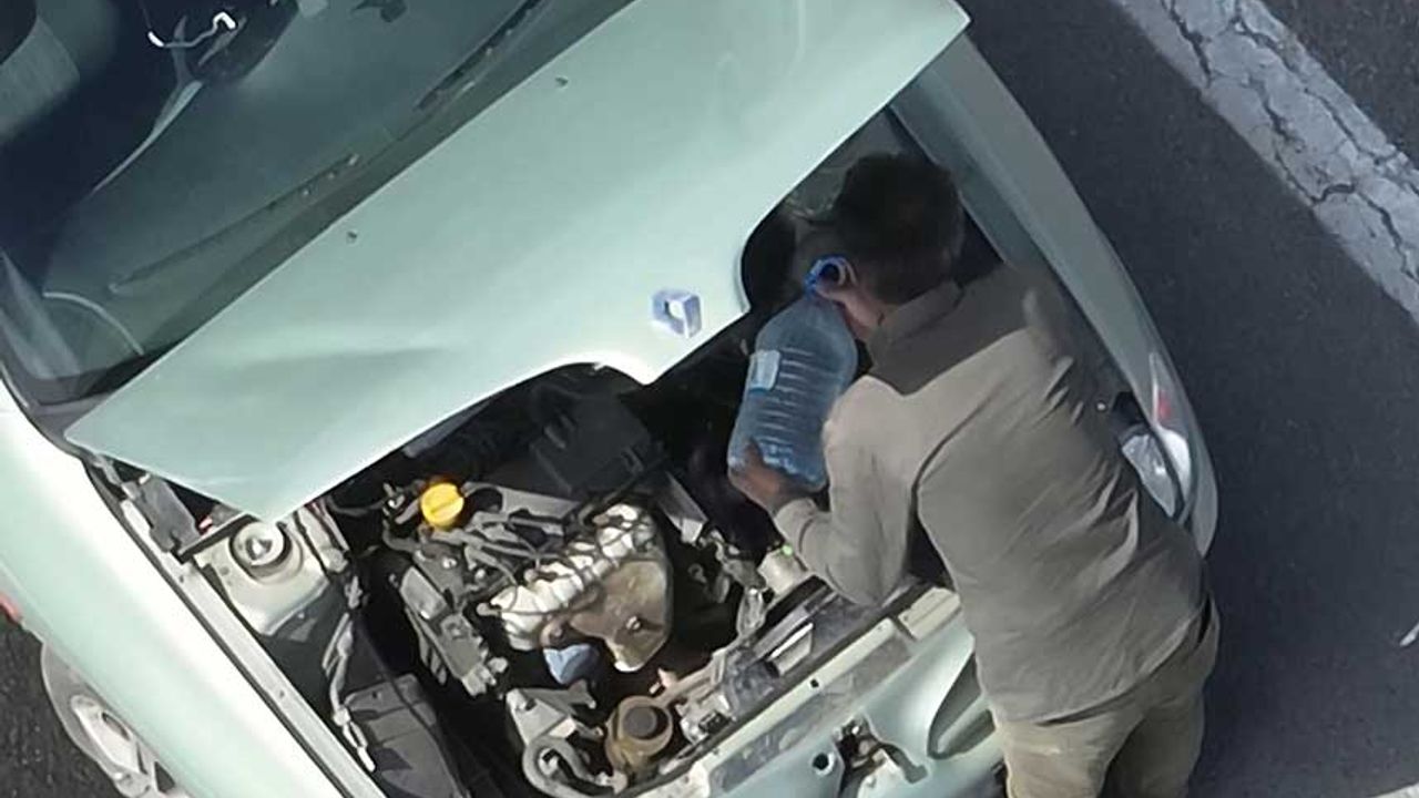 Uygulama noktasına yaklaşık 200 metre mesafede emniyet şeridinde duran otomobil, dron kamerasıyla takibe alındı. Elinde boş bir bidonla bir iş yerine giderek su alıp dönen sürücü aracın kaputunu açıp motor aksamını kontrol etti.