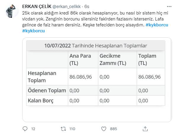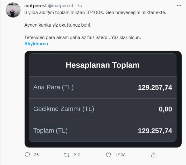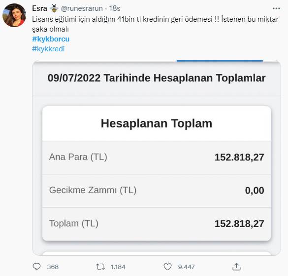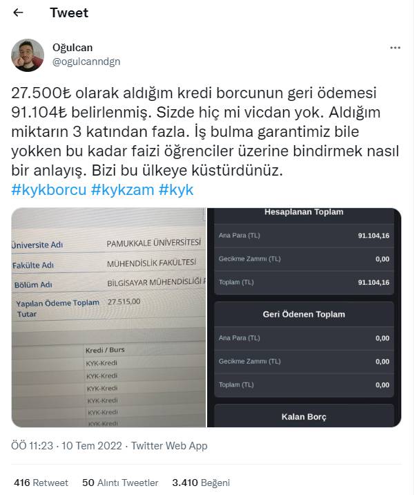 Bir öğrenci paylaşımında "27.500₺ olarak aldığım kredi borcunun geri ödemesi 91.104₺ belirlenmiş. Sizde hiç mi vicdan yok. Aldığım miktarın 3 katından fazla. İş bulma garantimiz bile yokken bu kadar faizi öğrenciler üzerine bindirmek nasıl bir anlayış. Bizi bu ülkeye küstürdünüz." ifadelerini kullandı.