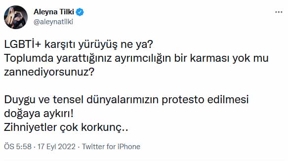 Yürüyüşü düzenleyen gericilere "Zihniyetleri çok korkunç" diyen Aleyna Tilki, "LGBTİ+ karşıtı yürüyüş ne ya? Toplumda yarattığınız ayrımcılığın bir karması yok mu zannediyorsunuz? Duygu ve tensel dünyalarımızın protesto edilmesi doğaya aykırı Zihniyetler çok korkunç" paylaşımını yaptı.