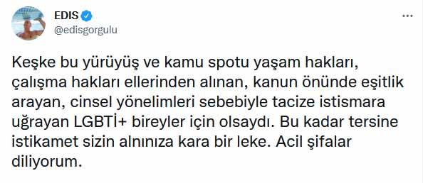 Yürüyüşle ilgili "Kara bir leke" vurgusu yapan Şarkıcı Edis, "Keşke bu yürüyüş ve kamu spotu yaşam hakları, çalışma hakları ellerinden alınan, kanun önünde eşitlik arayan, cinsel yönelimleri sebebiyle tacize istismara uğrayan LGBTİ+ bireyler için olsaydı. Bu kadar tersine istikamet sizin alnınıza kara bir leke. Acil şifalar diliyorum." şeklinde konuştu.