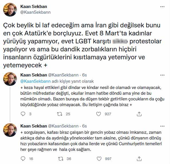 Komedyen Kaan Sekban ise "İran gibi değilsek bunu Atatürk'e borçluyuz" diyerek söz konusu yürüyüşlerin toplumun özgürlüğünü kısıtlayamayacağına vurgu yaptı. Sekban, "Çok beylik bi laf edeceğim ama İran gibi değilsek bunu en çok Atatürk'e borçluyuz. Evet 8 Mart'ta kadınlar yürüyüş yapamıyor, evet LGBT karşıtı protestolar yapılıyor ama bu dandik zorbalıkların hiçbiri insanların özgürlüklerini kısıtlamaya yetemiyor ve yetemeyecek. Keza hayal ettikleri gibi dindar ve kindar nesil de olamadı ve olamayacak, bütün müfredatlar değişti, okullar imam hatibe döndü ama yine de bu mümkün olmadı. Bazen buraya da düşen tekbir getirtilen çocukların da çoğu büyüdüğünde yobaz olmayacak. Bu iletişim çağında biraz sorgulayan, kafası biraz çalışan bir gencin yobaz olması imkansız, zaman aktıkça daha da aydınlığa yönelecekler tam aksine, çünkü dünyanın dönüş hızı yobazların kafasından çok daha ilerde ve çünkü Cumhuriyetin temelleri her şeye rağmen ve hala çok sağlam.