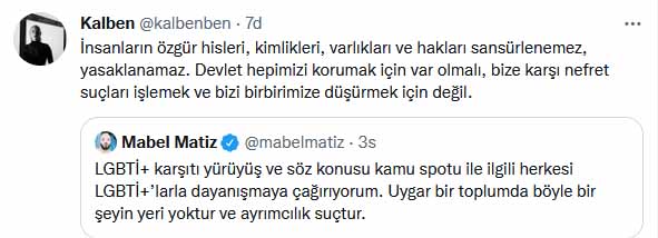 Şarkıcı Kalben, "İnsanların özgür hisleri, kimlikleri, varlıkları ve hakları sansürlenemez, yasaklanamaz. Devlet hepimizi korumak için var olmalı, bize karşı nefret suçları işlemek ve bizi birbirimize düşürmek için değil." dedi.