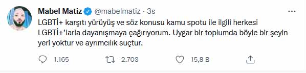 Mabel Matiz, yürüyüş ve RTÜK'ün onayladığı klip ile ilgili dayanışma çağrısı yaptı. Matiz, "LGBTİ+ karşıtı yürüyüş ve söz konusu kamu spotu ile ilgili herkesi LGBTİ+’larla dayanışmaya çağırıyorum. Uygar bir toplumda böyle bir şeyin yeri yoktur ve ayrımcılık suçtur." ifadelerini kullandı.