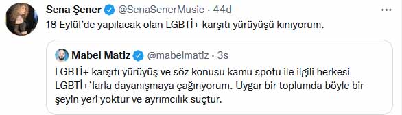 Sena Şener, sosyal medyada yaptığı tek cümlelik paylaşımla gericilerin yürüyüşünü kınadığını ifade etti. Şener, "18 Eylül’de yapılacak olan LGBTİ+ karşıtı yürüyüşü kınıyorum." ifadelerini kullandı.