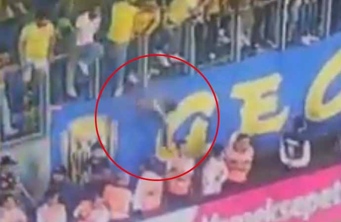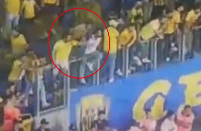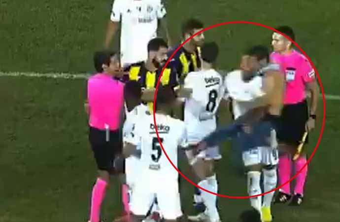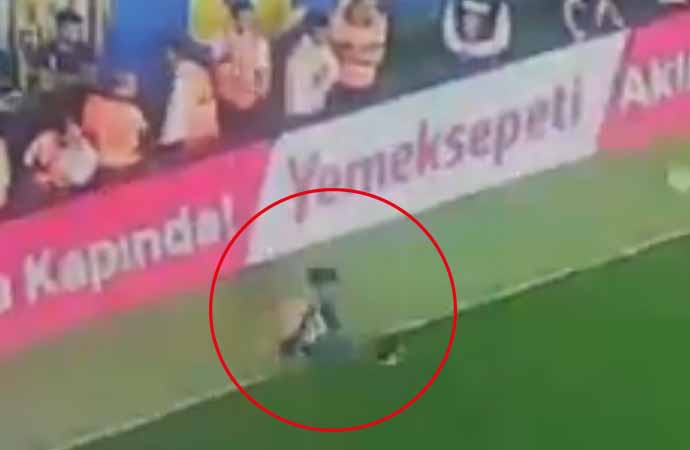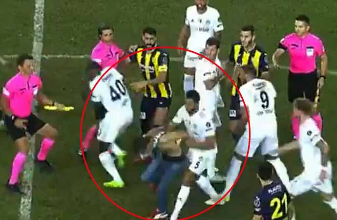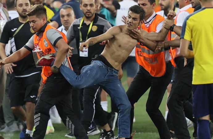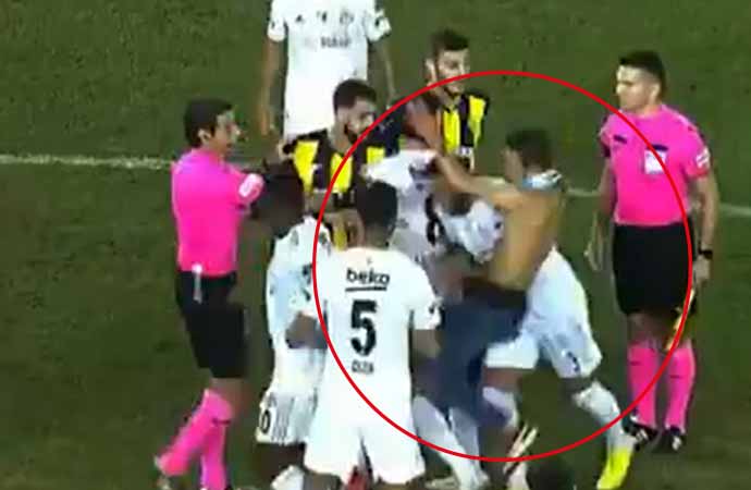 Ankaragücü taraftarının metrelerce yüksekten sahaya atladığı görülüyor. Güvenlik görevlilerinin de üzerinden atlayan taraftar saha içinde koşarak Beşiktaşlı futbolculara uçan tekme ile saldırdı.