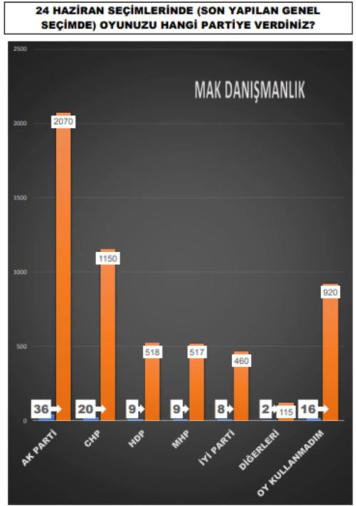 5-14 Mayıs tarihleri arasında gerçekleştirilen araştırmada seçmenler '24 Haziran seçimlerinde oyunuzu hangi partiye verdiniz?' sorusuna yüzde 36 AKP derken; CHP diyenlerin yüzdesi yüzde 20.