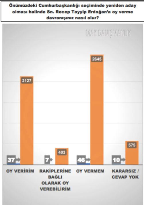 'Önümüzdeki Cumhurbaşkanlığı seçiminde yeniden aday olması halinde Sn. Recep Tayyip Erdoğan’a oy verme davranışınız nasıl olur?' sorusu üzerine yüzde 46 oy vermem dedi.