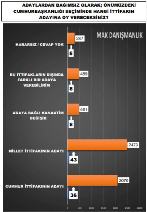 'Önümüzdeki Cumhurbaşkanlığı seçiminde hangi ittifakın adayına oy vereceksiniz?' sorusuna seçmenler yüzde 43'ü Millet İttifakı derken yüzde 36'lık kesim Cumhur İttifakı dedi.