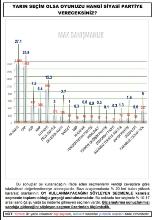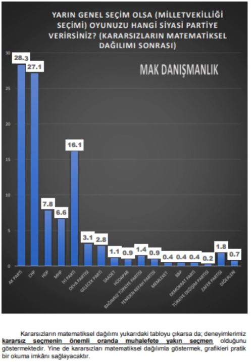 'Yarın genel seçim olsa (milletvekilliği seçimi) oyunuzu hangi siyasi partiye verirsiniz?' sorusuna seçmenler yüzde 28.3 AKP dedi. Yine AKP'nin yüzde 30'un altına düştüğü görülürken CHP diyen seçmen sayısı 27.1 oldu. İYİ Parti 16.1 oy oranı yakalarken MHP'nin oy oranı 6.6 olarak aktarıldı.
