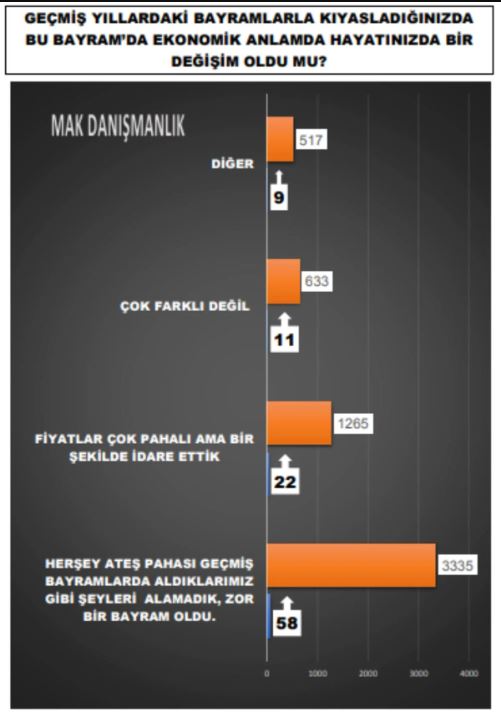 Araştırmaya katılanlara “Geçmiş yıllardaki bayramlarla kıyasladığınızda bu bayramda ekonomik anlamda hayatınızda bir değişim oldu mu?” sorusu yöneltildi. Vatandaşın yüzde 58’i “Her şey ateş pahası geçmiş bayramlarda aldıklarımızı alamadık” derken, vatandaşın yüzde 22’si “fiyatlar çok pahalı ama bir şekilde idare ettik” yanıtını verdi. Geçmiş bayramlarla bu bayramın çok farklı olmadığını söyleyenlerin oranı yüzde 11 oldu.