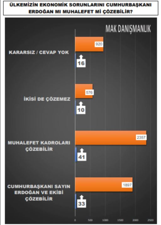 Ekonomik sorunları kim çözer sorusunda ise, yüzde 33 “Erdoğan ve ekibi” dedi. Muhalefetin sorunları çözeceğini düşünenlerin oranı yüzde 41 olurken, yüzde 10 ikisinin de çözemeyeceği görüşünde.