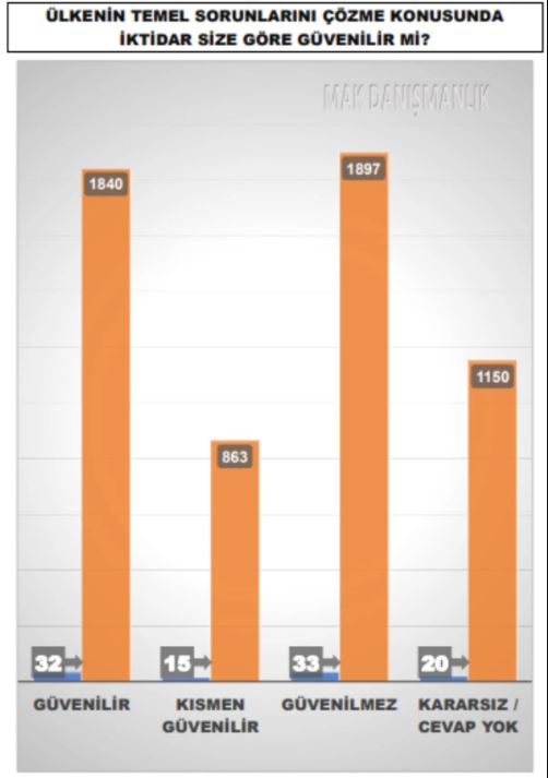 Ülkenin temel sorunlarını çözme konusunda iktidarı güvenilir bulmayanların oranı yüzde 33 iken kısmen güvenilir diyenlerin oranı ise yüzde 15 oldu.