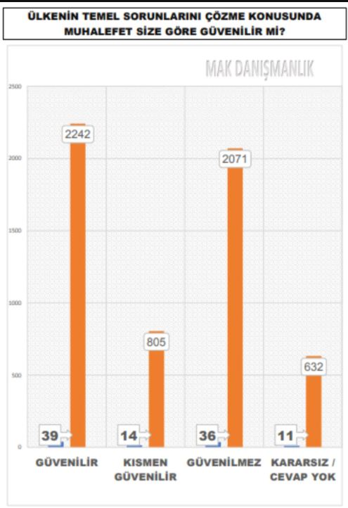 Ülkenin temel sorunlarını çözme konusunda muhalefete güvenenlerin oranı yüzde 39 olurken güvenilmez diyenlerin oranı ise yüzde 36 olarak açıklandı.