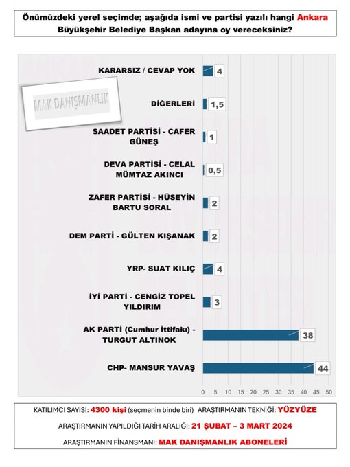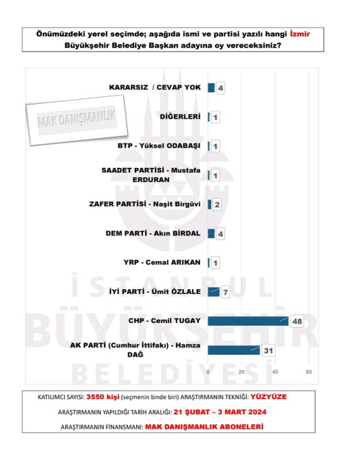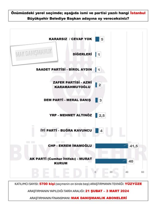 Yerel seçimlere kısa bir süre kala anket şirketleri de birer birer yaptıkları kamuoyu araştırmalarını yayınlamaya başladı. MAK Danışmanlık başkanı Mehmet Ali Kulat, MAK'ın son anketlerini yayınlarken Türkiye'nin en büyük üç şehrinde CHP'nin adaylarının önde çıkması dikkat çekti.