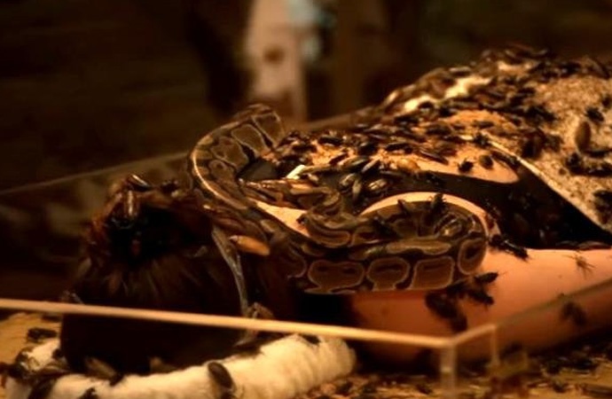 Böcek ve sürüngenlerden kurtulmak için saniye sayan kadınların üzerine son dakika sürprizi olarak devasa yılanlar bırakıldı.