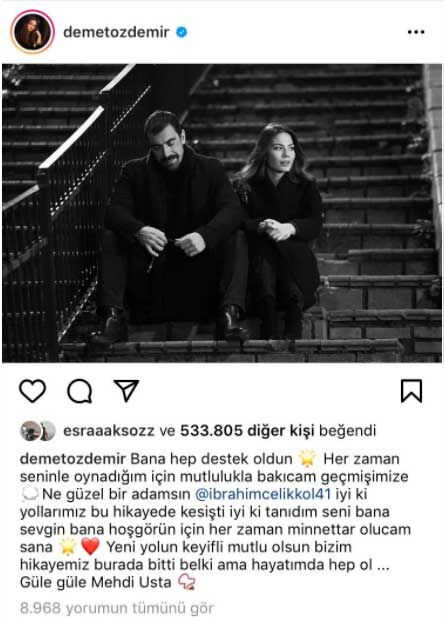 Dizinin ardından Çelikkol ve partneri Demet Özdemir sosyal medya hesaplarından veda mesajları içeren duygusal paylaşımlar yaptı.