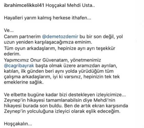 "Hoşça kal Mehdi Usta. Hayalleri yarım kalmış herkese ithafen... Ve canım partnerim Demet Özdemir. Bu bir son değil, yol uzun yeniden karşılaşacağımıza eminim. Tüm oyun arkadaşlarım, hepinize ayrı ayrı teşekkür ederim. Yapımcımız Onur Güvenatam, yönetmenimiz Çağrı Bayrak başta olmak üzere aramızdan ayrılan, katılan, ilk günden beri aynı yolda yürüdüğüm tüm çalışma arkadaşlarım, iyi ki varsınız, hepinizin tek tek emeklerine sağlık. Ve elbette bugüne kadar bizi destekleyen izleyicimize... Zeynep'in hikayesi tamamlanabilsin diye Mehdi'nin hikayesi burada son buldu. Ben de artık ekran karşısında Zeynep'in yolculuğuna izleyici olarak eşlik edeceğim. Hoşça kalın..."
