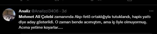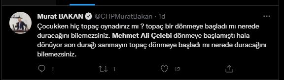 CHP Milletvekili Murat Bakan sosyal medya hesabından "Çocukken hiç topaç oynadınız mı ? topaç bir dönmeye başladı mı nerede duracağını bilemezsiniz. Mehmet Ali Çelebi dönmeye başlamıştı hala dönüyor son durağı sanmayın topaç dönmeye başladı mı nerede duracağını bilemezsiniz." ifadelerini kullandı.