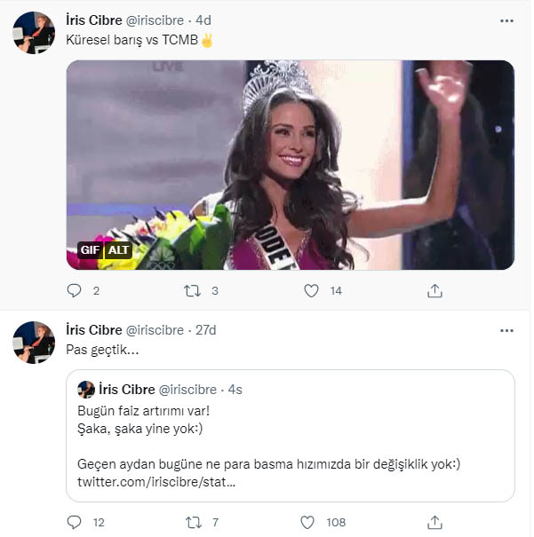 'Pas geçtik' diyen Ekonomist İris Cibre, Merkez Bankası'nın faiz karar metninde yer alan "Küresel barış" ifadelerine, "Küresel barış ve TCMB" diyerek gönderme yaptı.