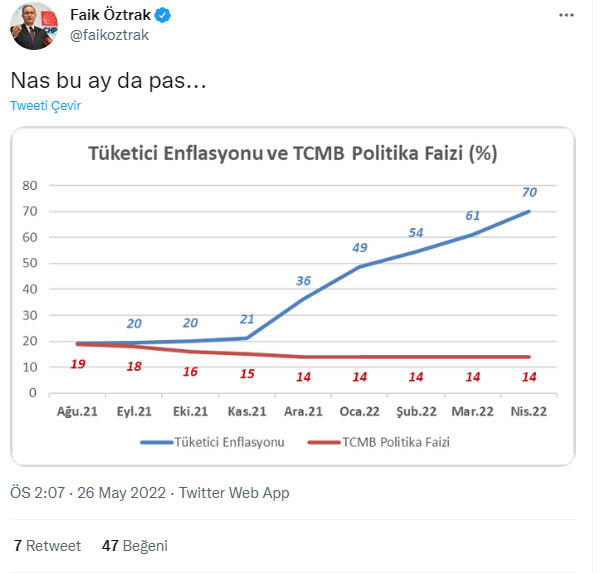 CHP Sözcüsü Faik Öztrak ise Merkez Bankası'nın ilk 'pas' dediği dönemin ardından enflasyonun artışını gösteren bir grafik yayınlayarak, "Nas bu ay da pas" ifadelerini kullandı.