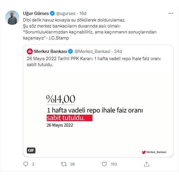 Ekonomst Uğur Gürses, Merkez Bankası'nın faiz kararına, Josiah Stamp'ın sözüyle yanıt verdi. Gürsesin paylaşımı şöyle, "Dibi delik havuz kovayla su dökülerek doldurulamaz.