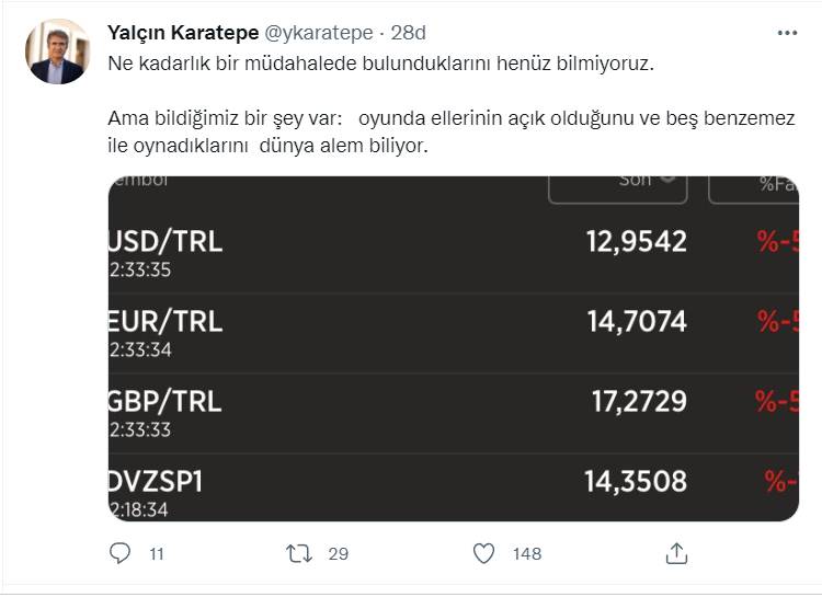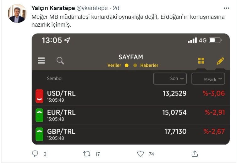 AKP'li Cumhurbaşkanı Erdoğan'ın grup toplantısına dikkat çeken Yalçın Karatepe ise "Meğer MB müdahalesi kurlardaki oynaklığa değil, Erdoğan’ın konuşmasına hazırlık içinmiş" yorumunu yaptı.