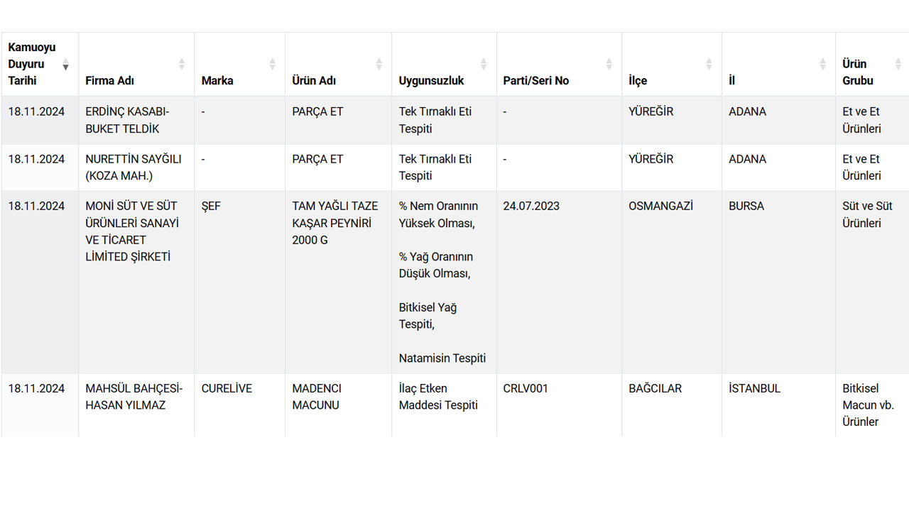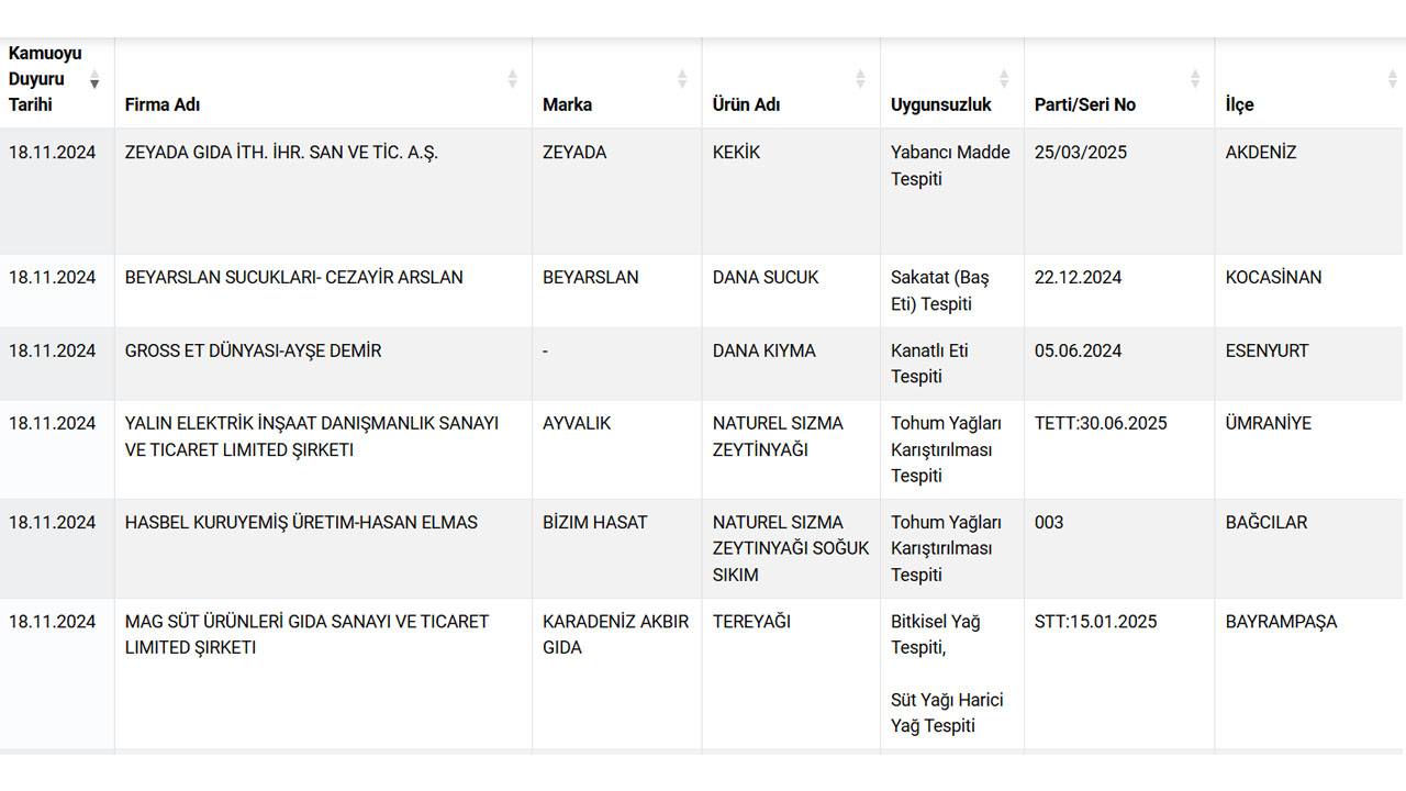'Sağlığı Tehlikeye Düşürecek Gıdalar' listesine 18 Kasım'da eklenen firmalar şu şekilde: