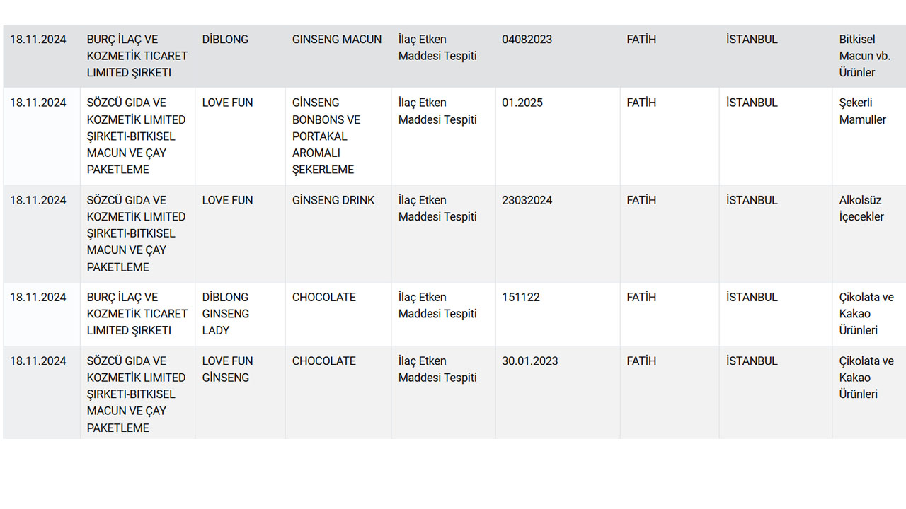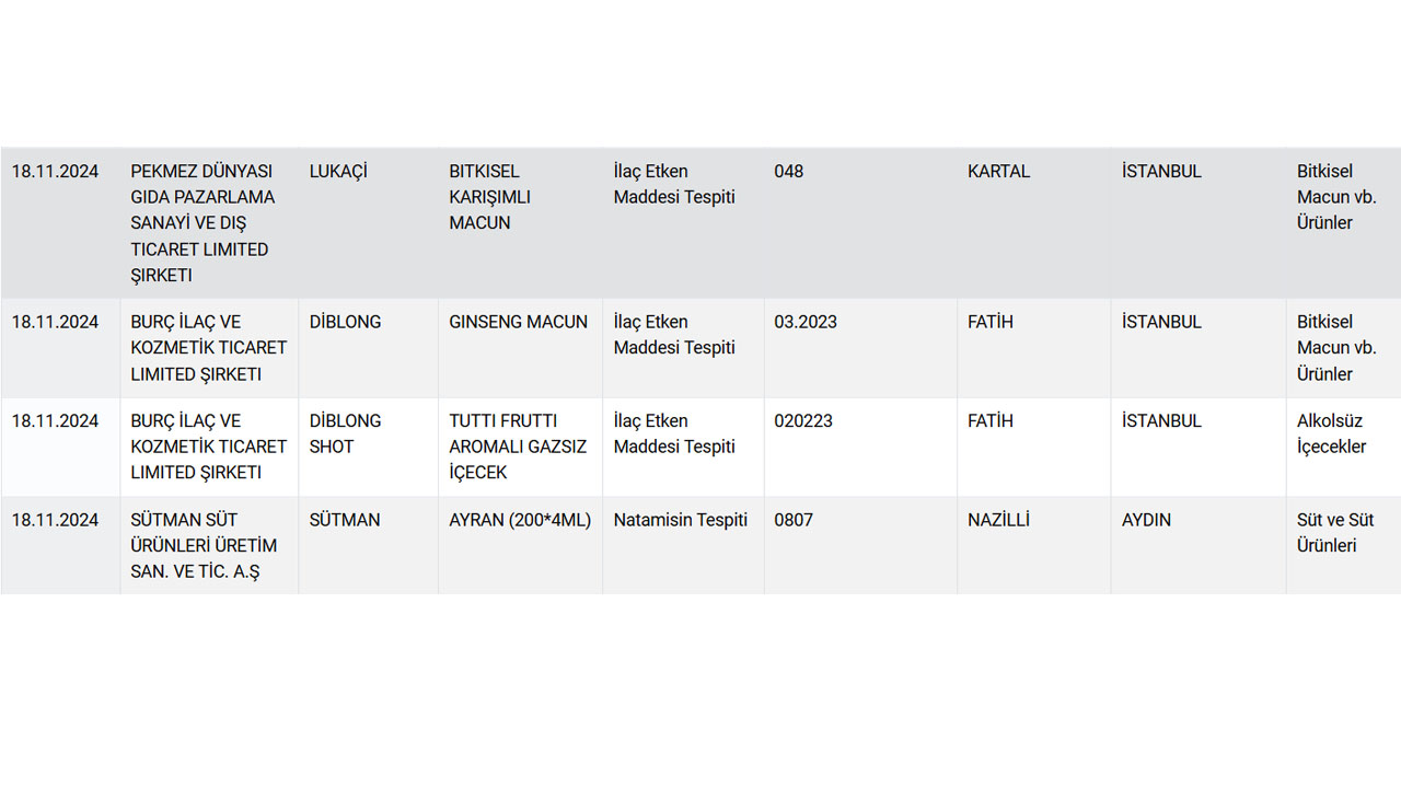 'Taklit veya Tağşiş Yapılan Gıdalar' listesine 18 Kasım'da eklenen firmalar şu şekilde: