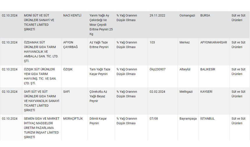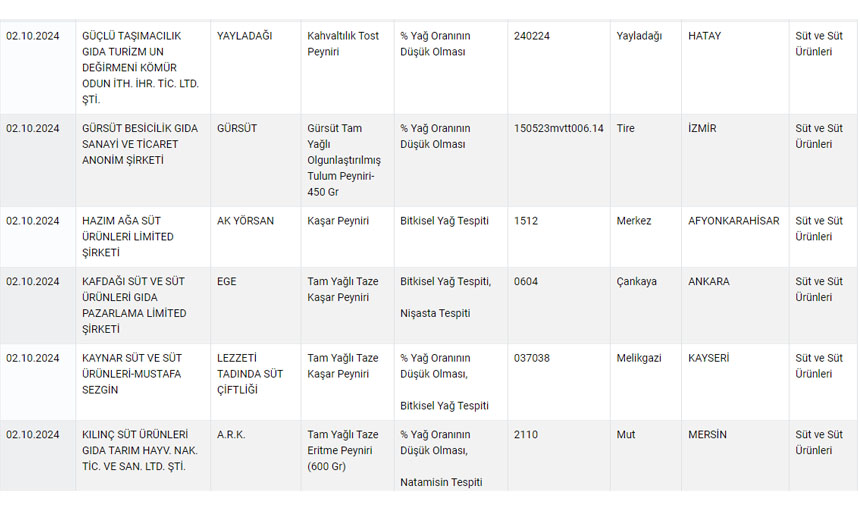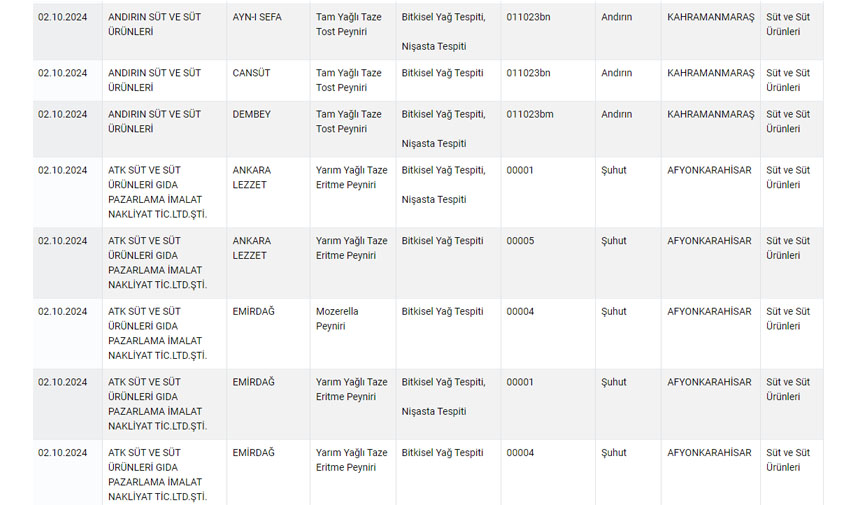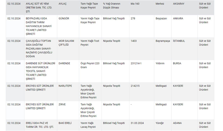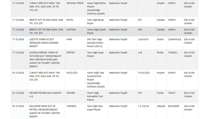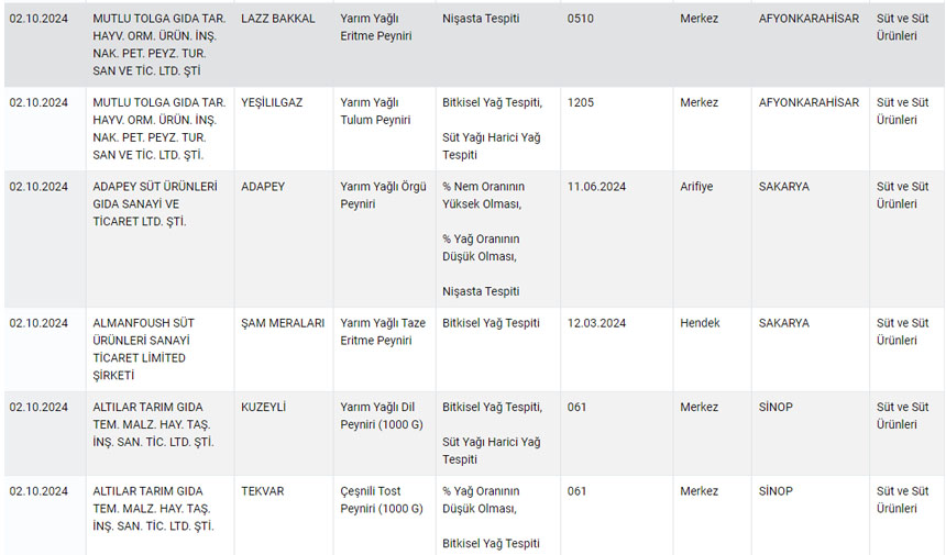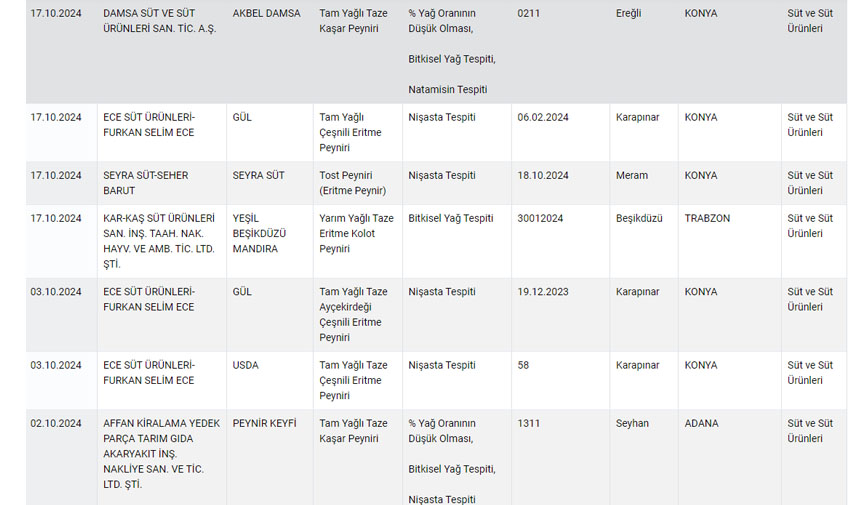 İşte 'Taklit veya Tağşiş Yapılan Gıdalar' listesinde yer alan peynir markaları: