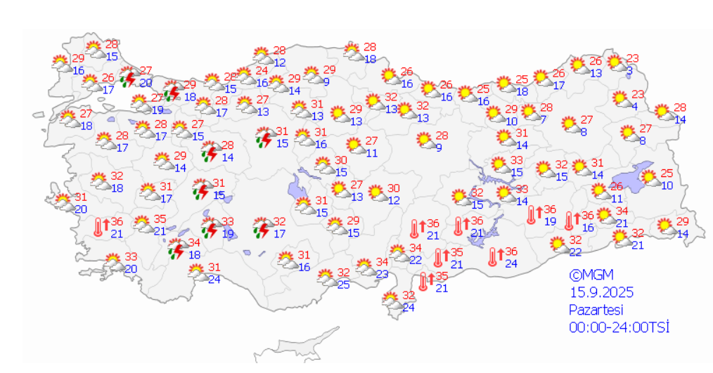 Meteoroloji Genel Müdürlüğü (MGM) tarafından yapılan son tahminlere göre, yurdun kuzey ve batı kesimlerinin parçalı yer yer çok bulutlu, öğleden sonra ve akşam saatlerinde Afyonkarahisar, Isparta, Burdur, Denizli ve Kütahya'nın yerel sağanak ile gök gürültülü sağanak yağışlı, diğer yerlerin az bulutlu ve açık geçeceği tahmin ediliyor.