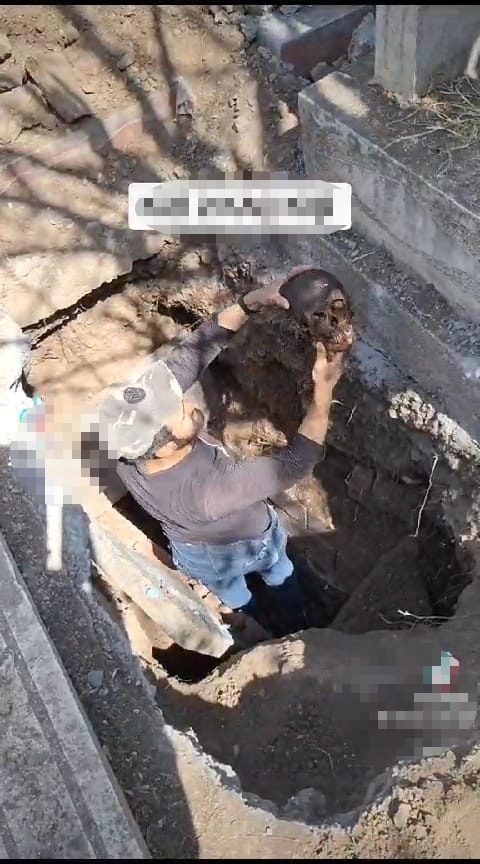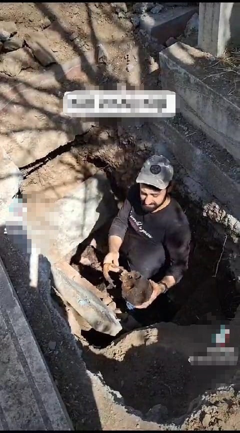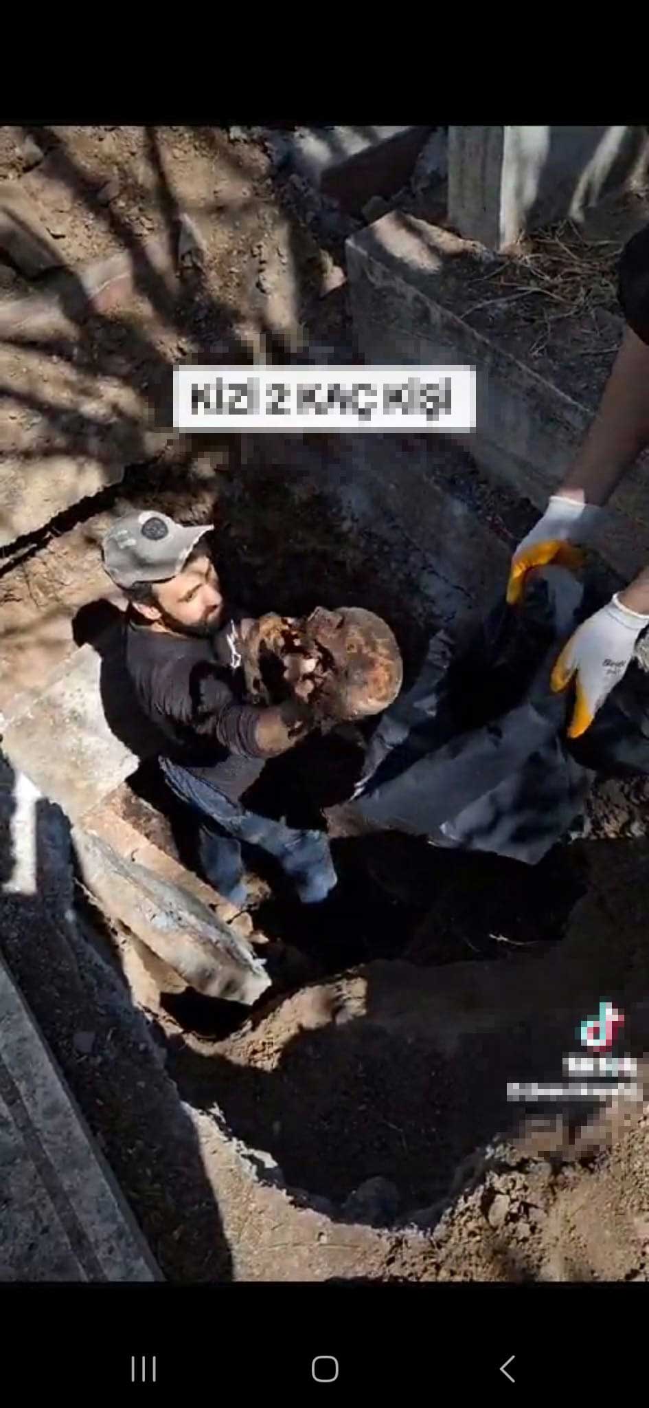 Paylaşımda, R.K.’nin açılan bazı mezarlardan çıkardığı kafatası ve kemikleri poşetlerin içine fırlattığı, el kol hareketleri yaparak dalga geçtiği görüntüler tepki çekti. Görüntülerde R.K., özensiz şekilde topladığı kemikleri poşetin içine fırlatıyor.
