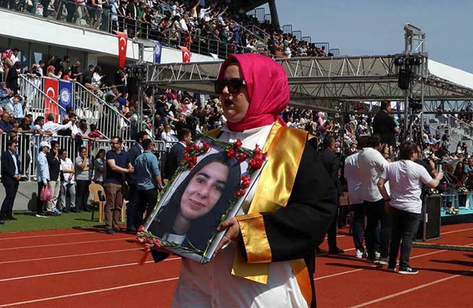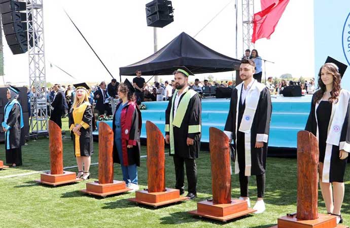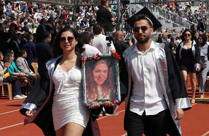 Geçit töreninde öğrenciler, Kahramanmaraş merkezli depremlerde hayatını kaybeden İktisadi ve İdari Bilimler Fakültesi Uluslararası İlişkiler Bölümü 4'üncü sınıf öğrencisi Ayşe Çinkılıç, Güzel Sanatlar Tasarım ve Mimarlık Fakültesi Peyzaj Mimarlığı Bölümü 4'üncü sınıf öğrencisi Gülistan Aktürk'ü anıp, fotoğraflarını taşıdı.