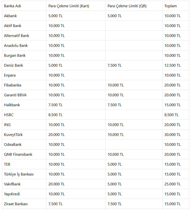 Bankaların kartlı işlemlerde değişikliğe gitmediği ve bazı özel bankaların QR kodlu para çekme işlemlerinde yükselttiği limitlerle birlikte güncel tablo şu şekilde: