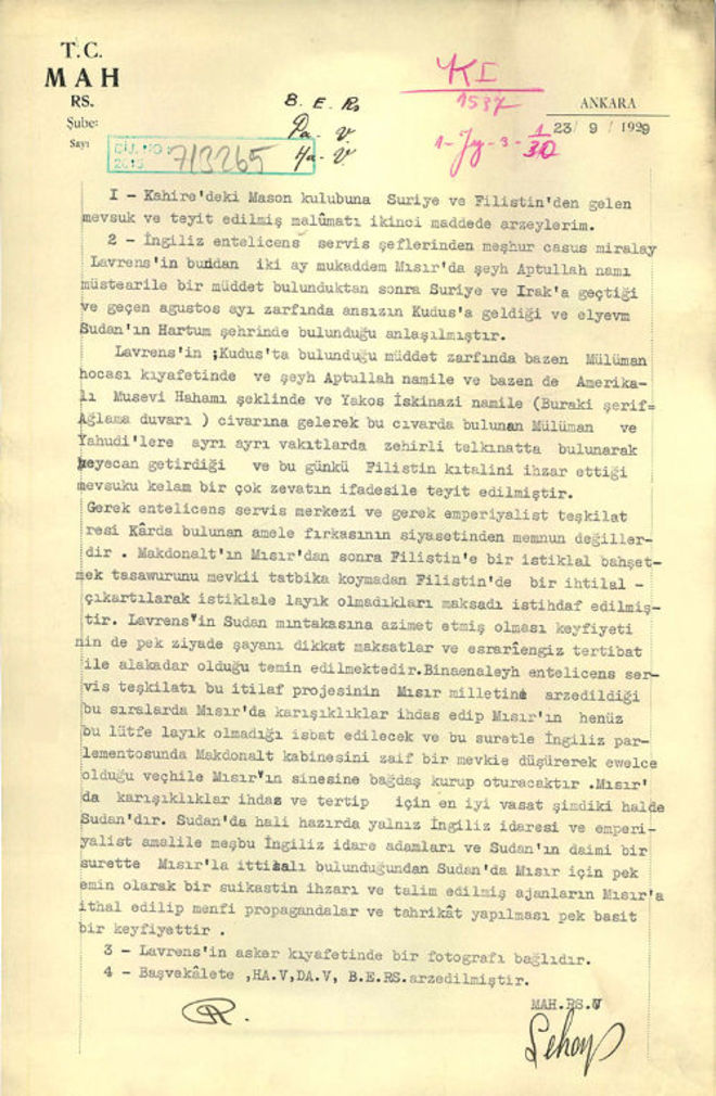 "Kahire'deki Mason kulübüne Suriye ve Filistin'den gelen mevsuk ve teyit edilmiş malumatı ikinci maddede arz eylerim. İngiliz entelicens servis şeflerinden meşhur casus Miralay Lavrens'in bundan iki ay mukaddem Mısır'da şeyh Aptullah namı müstearile bir müddet bulunduktan sonra Suriye ve Irak'a geçtiği ve geçen ağustos ayı zarfında ansızın Kudüs'e geldiği ve elyevm Sudan'ın Hartum şehrinde bulunduğu anlaşılmıştır.