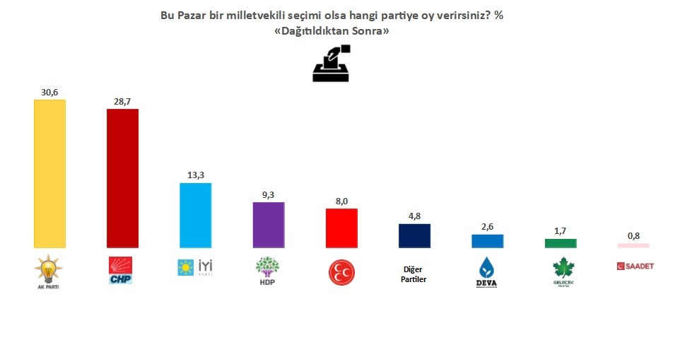 Araştırmada, DEVA Partisi’nin oy oranı yüzde 2,6, Saadet Partisi’nin oy oranı yüzde 0,8 ve Davutoğlu’nun liderliğini yaptığı Gelecek Partisi’nin oy oranı ise yüzde 1,7 oldu.