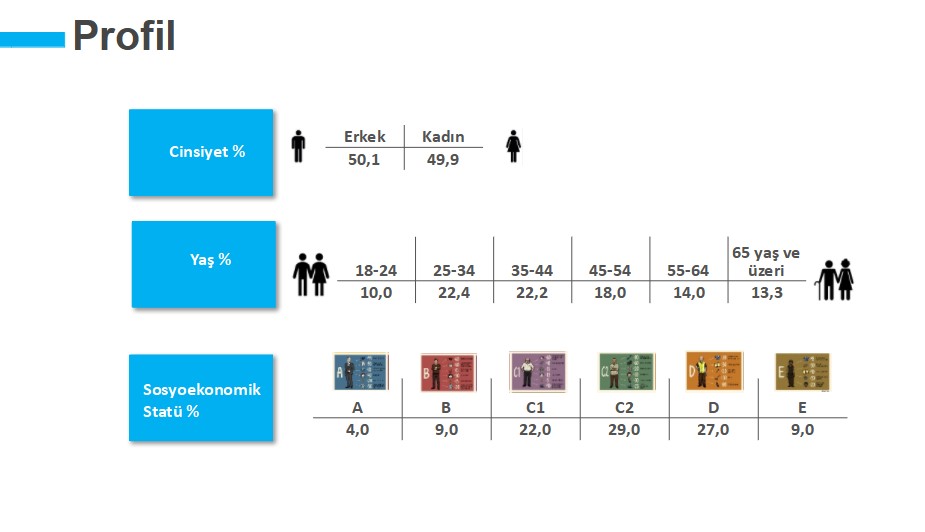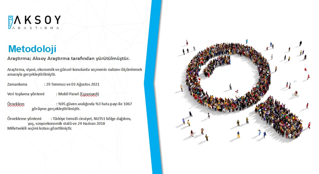Mobil panel üzerinden gerçekleştirilen araştırmada yüzde 95 güven aralığında yüzde 3 hata payıyla yapılan 1067 görüşmede, Türkiye temsili cinsiyet, NUTS1 bölge dağılımı, yaş, sosyoekonomik statü ve 24 Haziran 2018 Milletvekili seçimi kotası gözetildi.