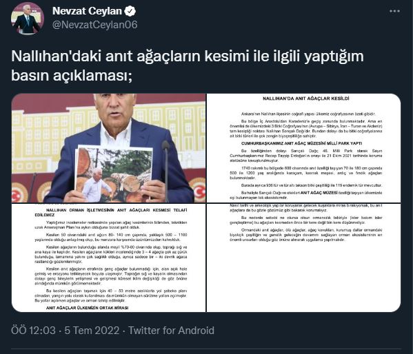 Ceylan'ın konuya ilişkin Ceylan, Meclis'te düzenlediği basın toplantısında, Orman Genel Müdürlüğü'nün ağaçların kesildiği bölgenin 21 Ekim 2021'de Cumhurbaşkanı Recep Tayyip Erdoğan'ın onayı ile Sarıçalı Dağı Milli Parkı olarak koruma statüsüne kavuşturulan Nallıhan yakınlarındaki ormanlık alana dahil edilmesine izin vermediğini söyledi.