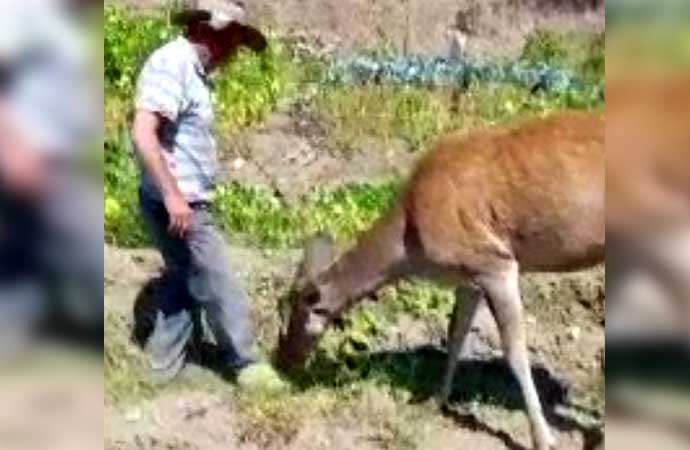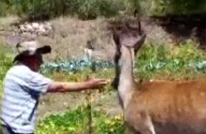 Görüntülerde, vatandaşlardan birinin geyiğin yanına yaklaştığı ve dokunarak sevdiği anlar da yer aldı. Görüntüyü çeken kişinin ise "Şu an Yaşar dayının kavunlarını yiyor. Gelmiş kavunları yiyor. Hayırlı olsun dayı. Yaşar dayım bak geyiği ne güzel seviyor. Kavun yedir bari. Dişi bir geyik. Sütü var herhalde yavrulamış galiba. 'Meh meh' diyor bak. Bonkör adam canım. Ye taze. Koca keleği ağzına ald, vallahi kopardı, koydu. Gel kızım gel. Hele ceylanım" sözleri duyuldu. Görüntüler, sosyal medyada da ilgi gördü. Bugün çekilen görüntülerde, kendisine yaklaşanlardan korkmayan geyik, bir süre sonra gözden kayboldu.