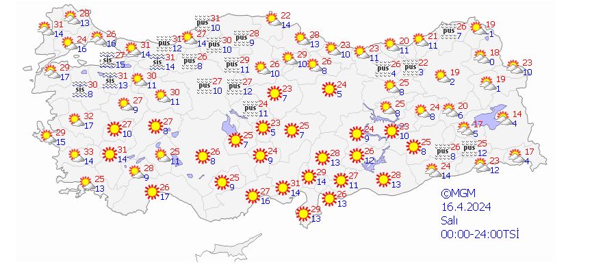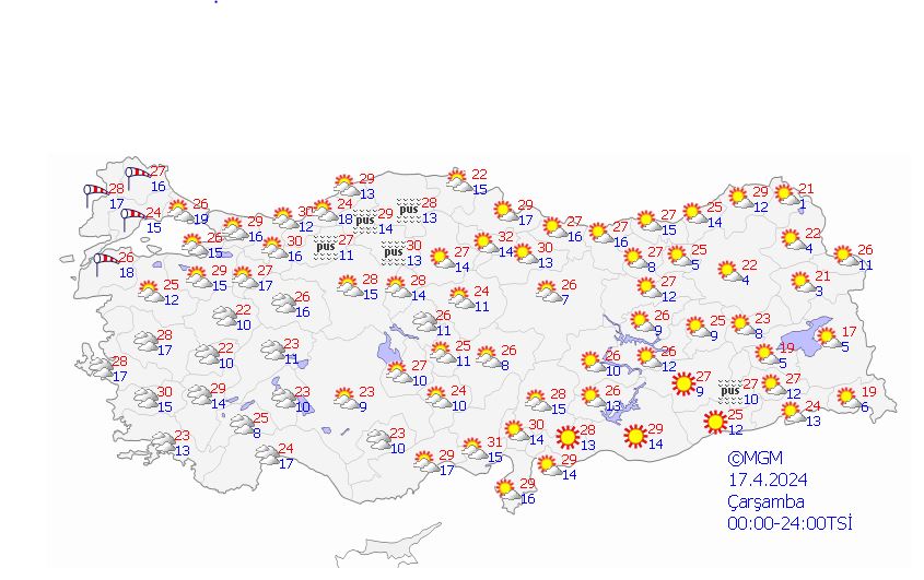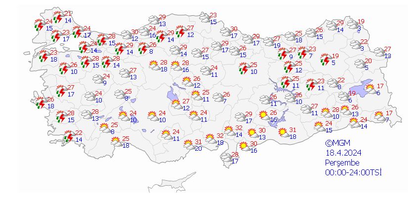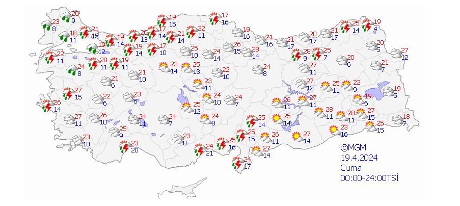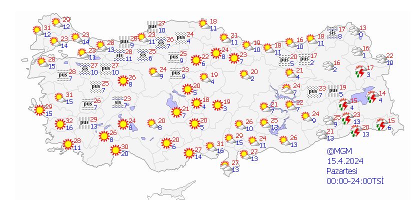 Ülkemizin doğu kesimlerinin parçalı ve yer yer çok bulutlu, Doğu Anadolu'nun güneydoğusu ile Ağrı ve Mardin çevrelerinin yerel olmak üzere sağanak ve gök gürültülü sağanak yağışlı, diğer yerlerin parçalı ve az bulutlu geçeceği tahmin ediliyor. Marmara ile iç ve doğu kesimlerinde bu sabah ve gece saatlerinde pus ve yer yer sis hadisesi beklenmektedir. Doğu Karadeniz’in iç kesimleri ile Doğu Anadolu’nun kuzey ve doğusunda çığ tehlikesi bulunmaktadır.