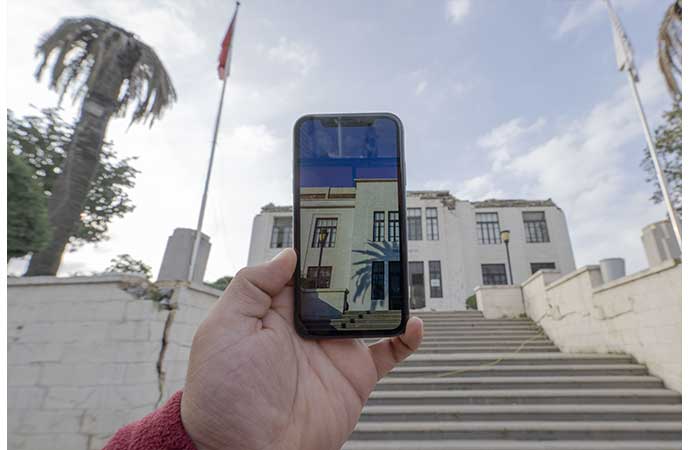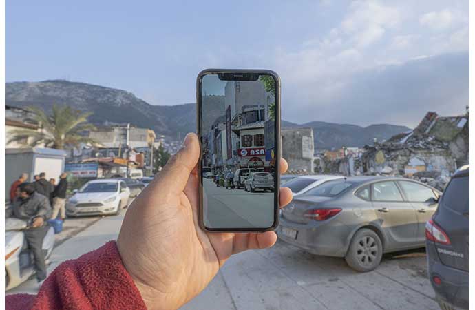 Arşivdeki fotoğrafların, cep telefonu ekranına bir bölümü yansıtılarak tekrar fotoğraflandığı projede felaketin izleri görülüyor.