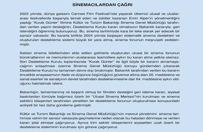 Çağrı metninde olay, "Sinema tarihizde kara bir leke olarak yer edecek bir sansur vakası" olarak nitelenirken sinema fonunun meşruiyetini yitirdiği değerlendirmesinde bulunuldu. Metinde ayrıca, "Bakanlığın, tamamlanmış ve başarılı olmuş bir filmden desteğini geri isteme kararı, siyasal baskılardan tümüyle bağımsız özerk bir 'Ulusal Sinema Merkezi'nin kurulması ve sinama sektörü bileşenleri tarafından yönetilen bir destekleme fonunun oluşturulması konusundaki aciliyeti bir kez daha gündeme getirmiştir" ifadelerine yer verildi.